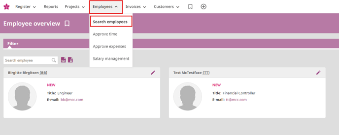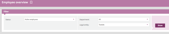 If you are looking for an active employee, you may enter the name or initials in the search field marked with Search employee, or choose to use the filter on top of the page by clicking Filter below the headline Employee overview and enter License type, Status and Department, and click Show.
