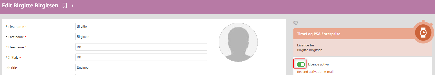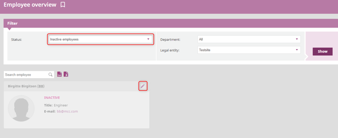 If you want to re-activate an inactive employee, you click the pen in the upper right corner of the employee card. Then, you are directed to a new page, where you move the slider an re-activate the employee on the right hand side.