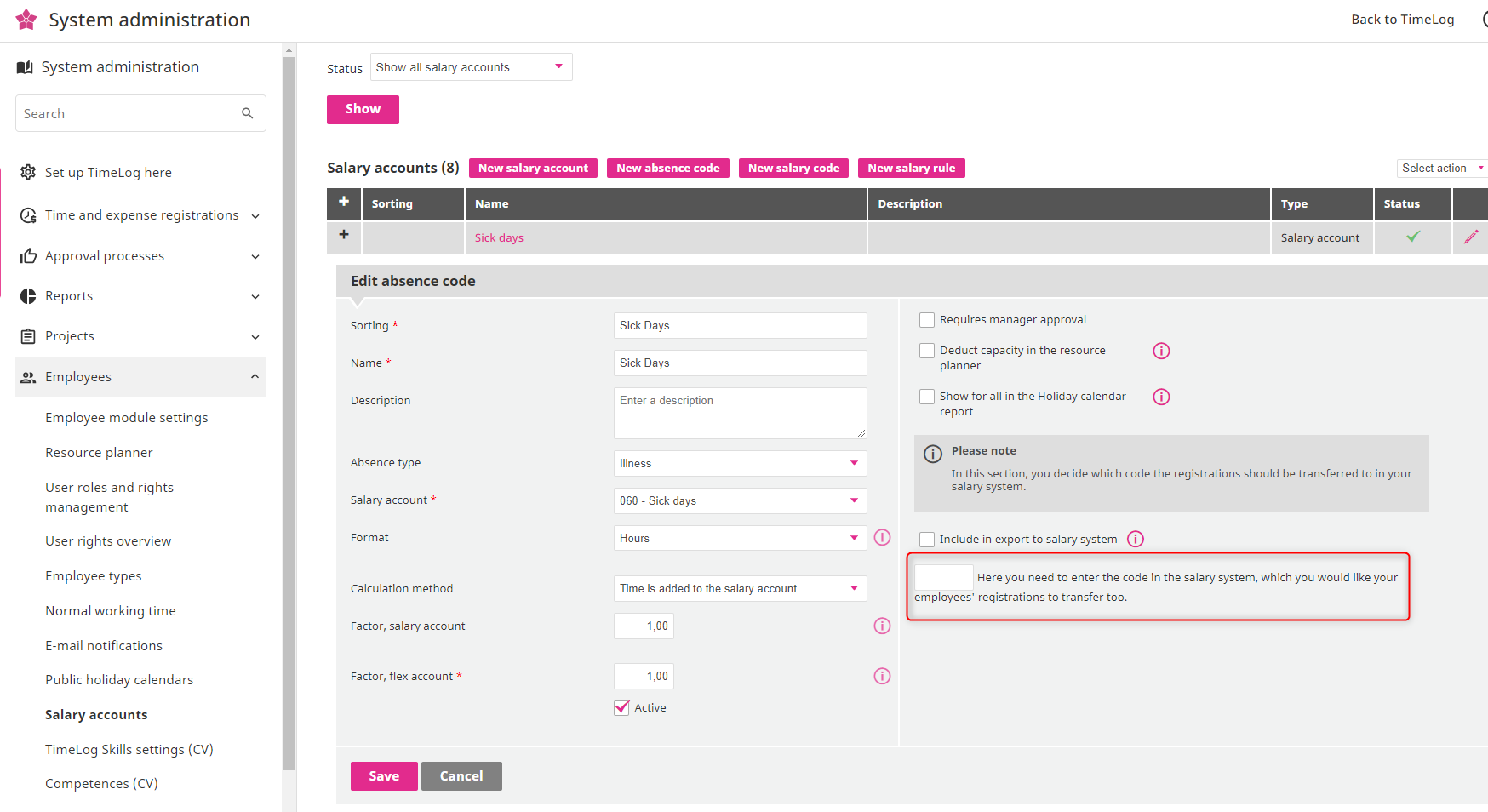 6. The last step, before you are ready to transfer a file is to add the correct salary codes in the absence codes in the system administration. Please see the recommendations in the next section.