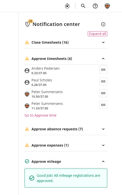 - You have any timesheets, absence requests, expenses, or mileage to approve