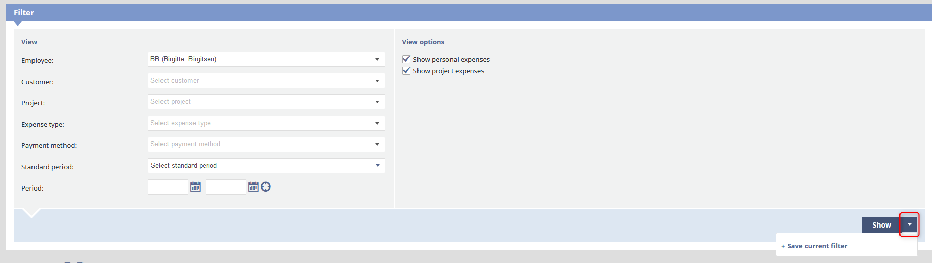 On the top of the page in Filter, you select the criteria you want to search for. Next to the Show button, there is an arrow which opens the opportunity to save the current filter or load and use previous filters. You can collapse the filter, so you get more space for the expense list.