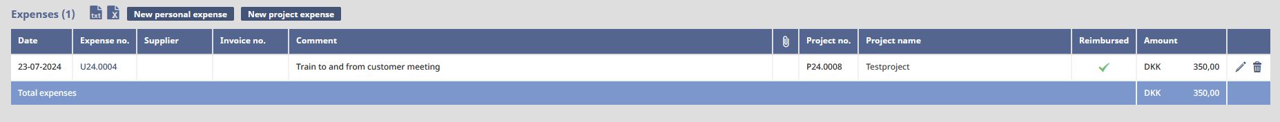In the results list, you see your expenses for the period you selected in the filter. For each expense, you see the details you have entered and saved in the system. If you have added a picture, you can see it via the marking under the paper clip.