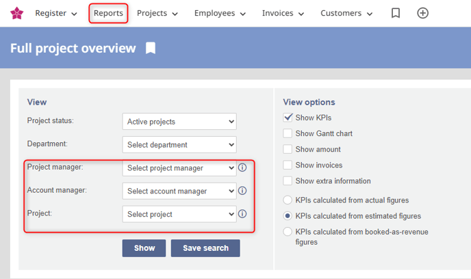 - Under View Options, select what to include in the report: KPIs, Gantt charts, invoices etc.