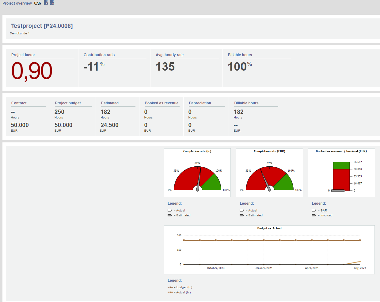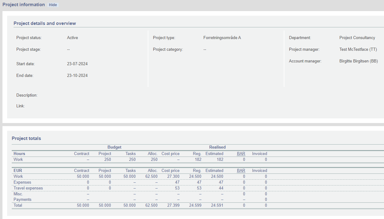 This report presents all relevant project data in a stylish design, which can then be exported to e.g. Word or Excel. This report features all project data, including contribution margin, level of completion, project totals, project plan in hours and DKK, Gantt charts etc.