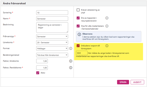 Välj "Inkludera i export till lönesystem" och lägg till relevant tidskoder i textfältet.